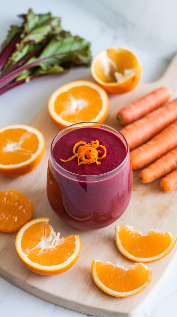 Carrot adds mild sweetness and thickness, while orange juice keeps everything fresh and citrusy. Beetroot ties it all together with a deeper flavor and that gorgeous ruby color. I’ve made this one during cold season and it honestly feels like an immune boost in smoothie form.