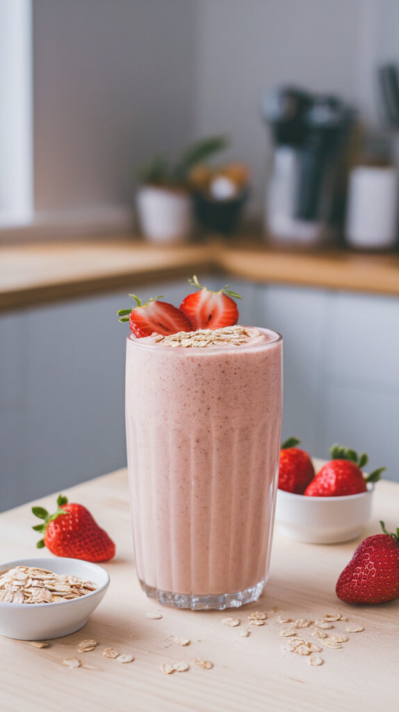 Oats absorb liquid and thicken the smoothie naturally, which makes it feel creamy even without yogurt. Frozen strawberries also help keep it cold and thick without watering it down. The banana acts included sweetness and gives it that classic smooth texture.