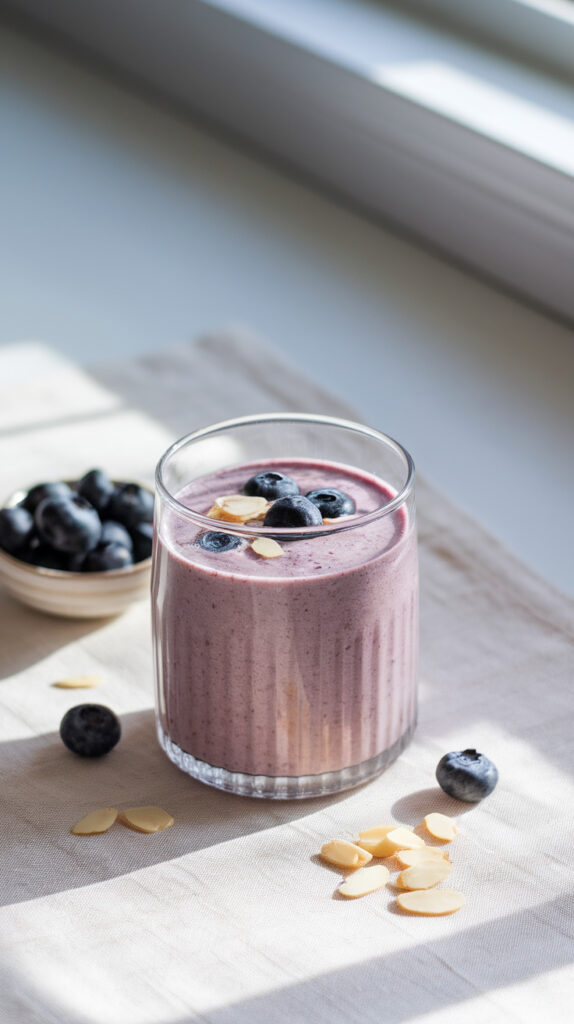 Blueberries bring antioxidants and sweetness, but almond butter adds fat and depth so it doesn’t taste like fruit water. Vanilla enhances the sweetness without adding sugar. The result feels balanced and creamy.