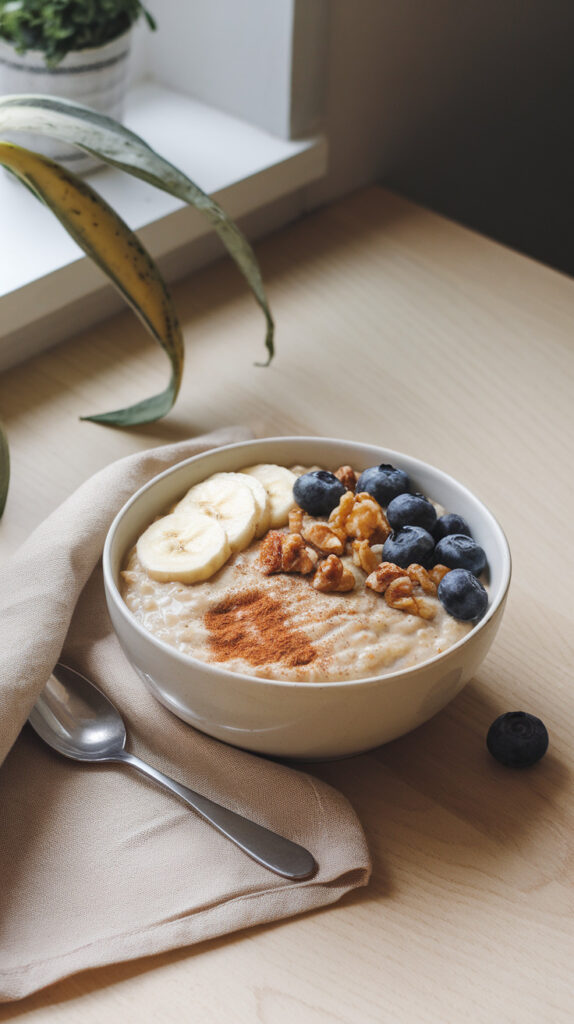 Oats contain soluble fiber, which helps support healthy cholesterol levels by binding to certain fats in digestion. The banana adds natural sweetness so you don’t need syrup, and the nuts give you healthy fats that keep you full longer. The creamy texture makes it feel comforting instead of “diet food.”