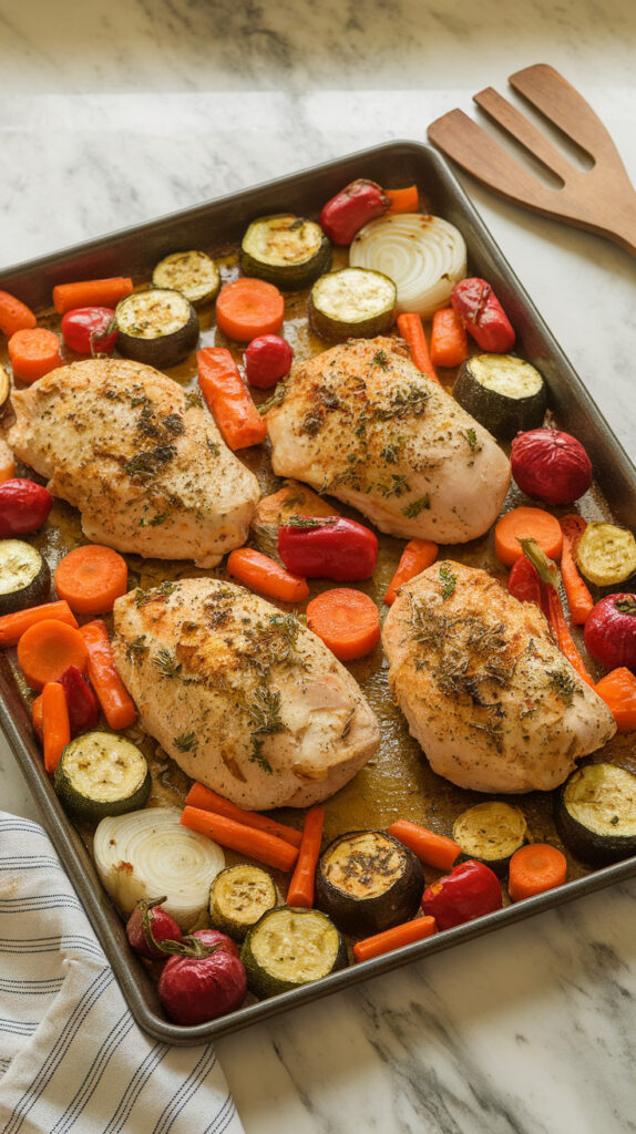 - Cook another 18–22 minutes until chicken is done and veggies are browned.