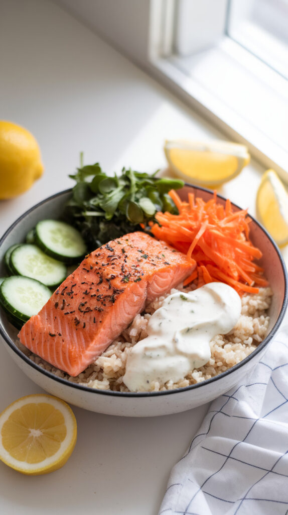 Salmon is rich in omega-3 fats, which are great for heart health. Brown rice adds fiber and keeps the bowl filling without refined carbs. Greek yogurt gives you creaminess with less saturated fat than sour cream. The whole bowl hits that balance of protein, fiber, and healthy fats.