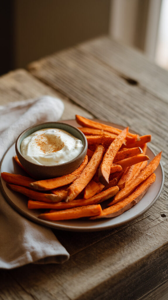 Sweet potatoes provide fiber and nutrients while being naturally lower in unhealthy fats than fried snacks. Baking instead of frying cuts down on added saturated fat. The yogurt dip replaces creamy mayo-based sauces with something lighter. This recipe gives you comfort food vibes while staying heart-friendly.