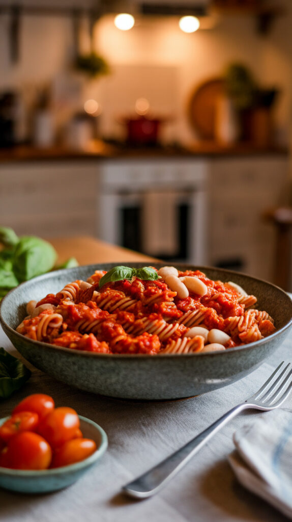 Whole wheat pasta adds fiber compared to regular pasta. White beans boost plant-based protein and make the dish more filling without meat. Tomato sauce is naturally low in saturated fat and pairs well with herbs. It’s balanced, hearty, and still feels like pasta night.