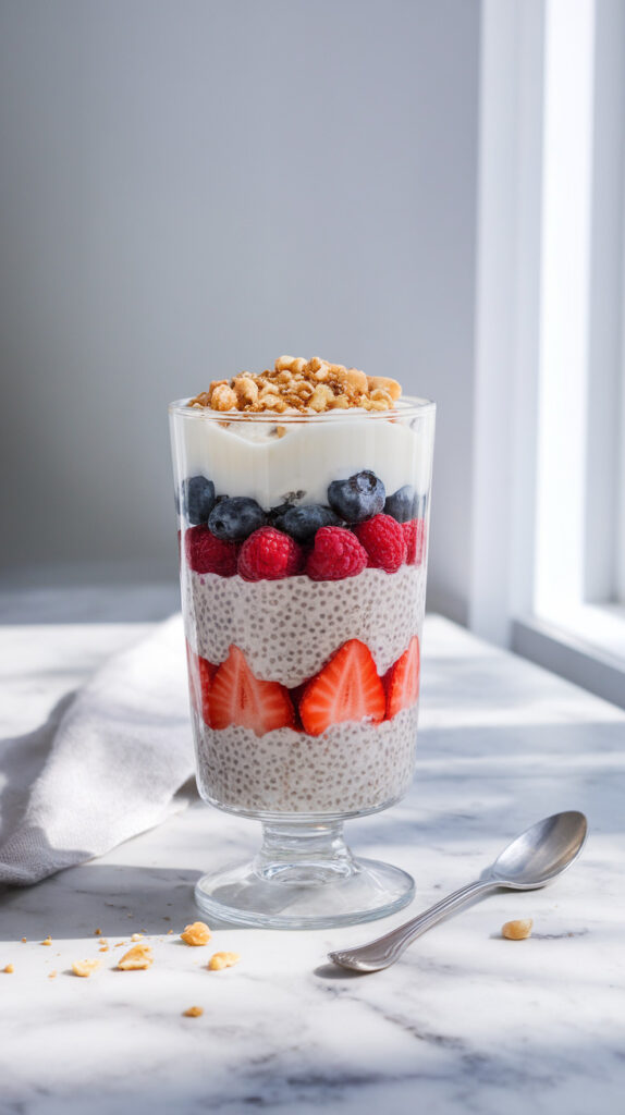 Use a clear glass if you want it to feel fancy and “Pinterest-worthy” without trying too hard. Don’t add too much chia at once or it becomes thick like pudding glue. Mix in strawberries, blueberries, and raspberries for different textures. Avoid flavored yogurt with added sugar because it defeats the whole point.