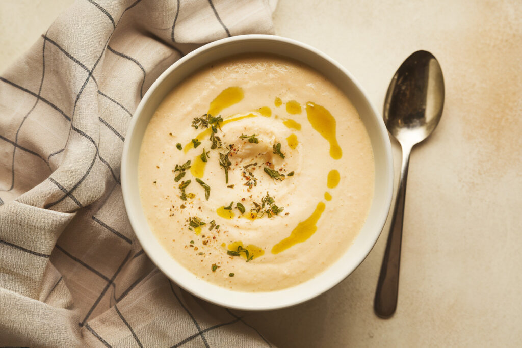 Cauliflower pulls most of the weight here, and it does the job surprisingly well. Once it blends down with a few simple ingredients, the result tastes creamy, cozy, and way more luxurious than the ingredient list suggests.