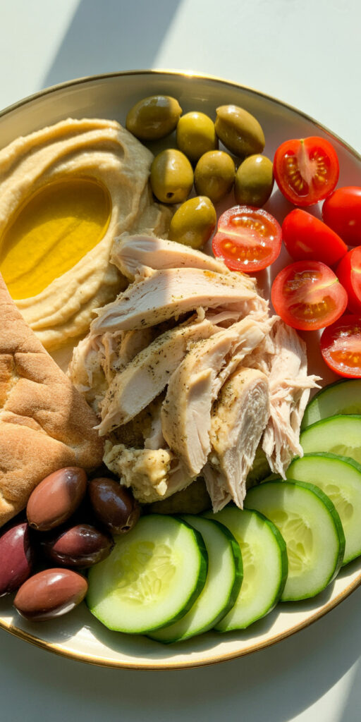 Sometimes a plate of simple components beats a complicated recipe. This Mediterranean-style setup feels fresh and balanced. It’s more assembling than cooking.