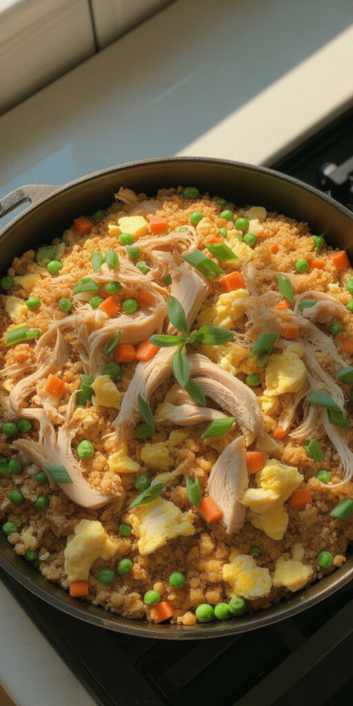 Cravings for fried rice don’t disappear just because you’re eating healthy. Swapping regular rice for cauliflower lowers carbs while keeping texture. The chicken makes it hearty.