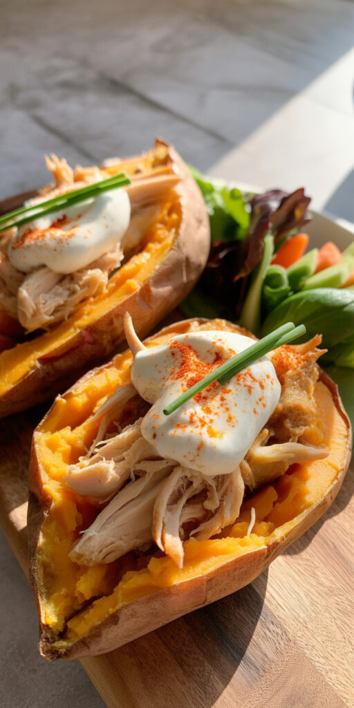 Sweet potatoes naturally feel comforting. Filling them with shredded chicken turns them into a complete meal. The sweetness balances savory protein perfectly.