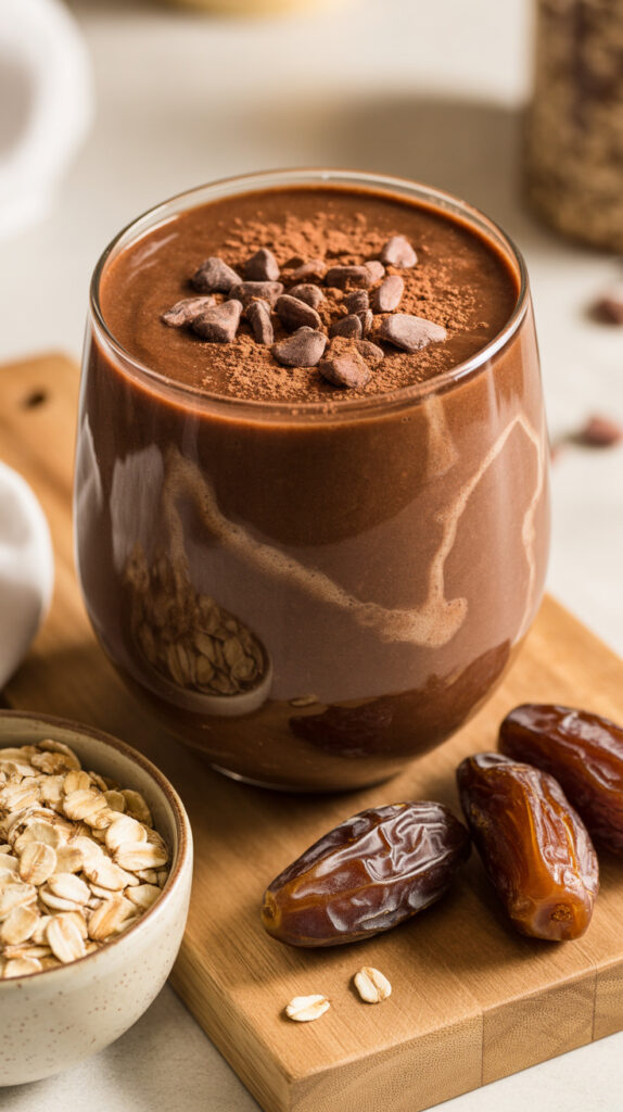 This one is for the days when you want chocolate but also want to pretend you’re making a responsible decision. The cocoa gives you that deep dessert flavor, while oats and dates turn it into something thick and filling. It honestly tastes like a brownie in smoothie form.