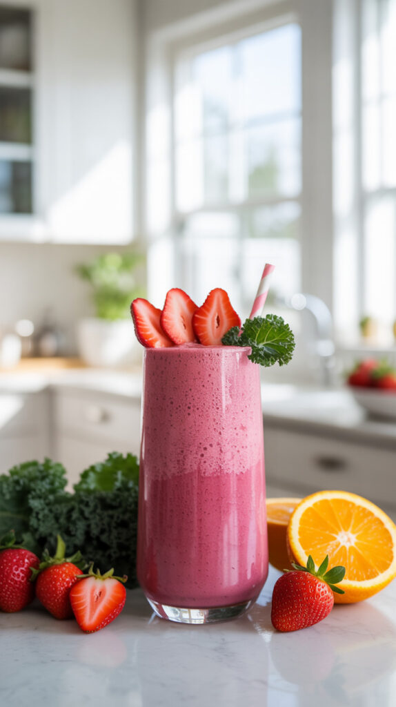 Kale has a reputation for being bitter and dramatic, but strawberries basically shut it up. When you add citrus juice, the whole smoothie becomes bright, sweet, and refreshing. It’s one of those smoothies that makes you feel like you’re doing something good for yourself without suffering.