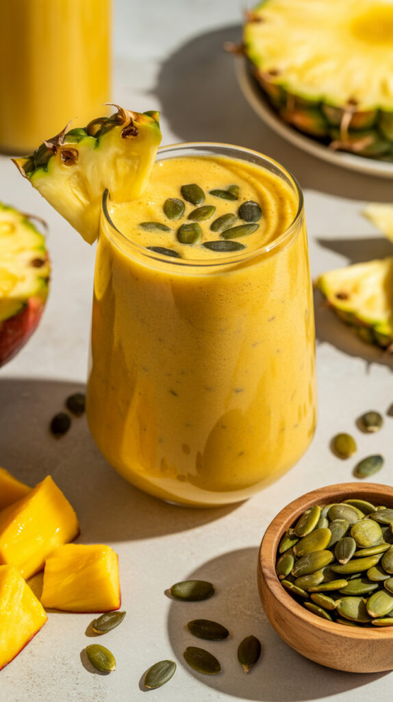 It tastes like a tropical smoothie shop drink but has serious nutrition behind it. The pumpkin seeds add richness that makes it feel satisfying.