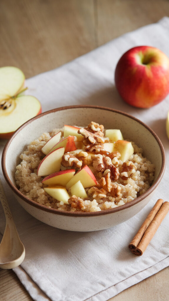 Quinoa is high in plant protein and naturally cholesterol-free, which makes it a strong breakfast base. Apples add fiber, and cinnamon adds sweetness without sugar, which helps keep the whole bowl balanced.