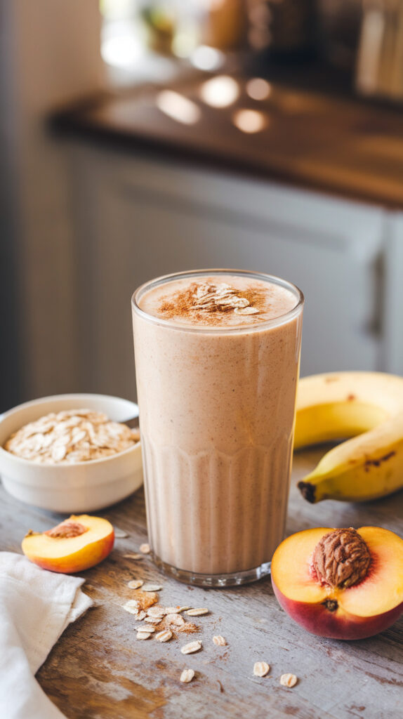 I started making this one because I got tired of smoothies that left me hungry again in 45 minutes. The oats add fiber, the banana adds creaminess, and the peaches make it taste like something you’d order at a fancy brunch place. It’s basically breakfast that doesn’t require chewing.