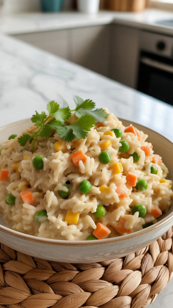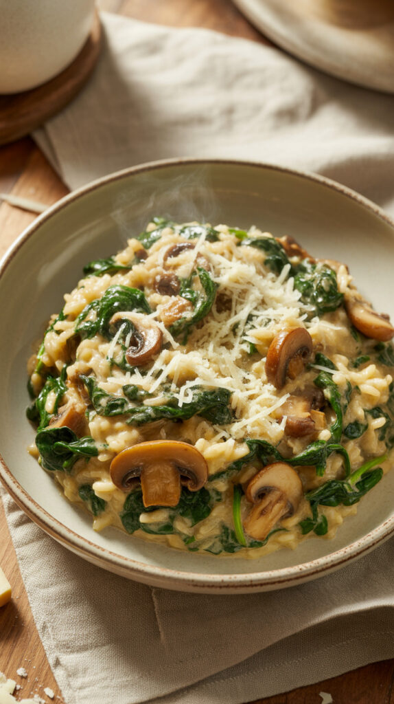 Some dinners need comfort without turning into a full pasta situation. Creamy rice delivers that cozy feeling while still letting vegetables shine instead of hiding them under sauce. Mushrooms add depth while spinach keeps everything light enough for weeknights.