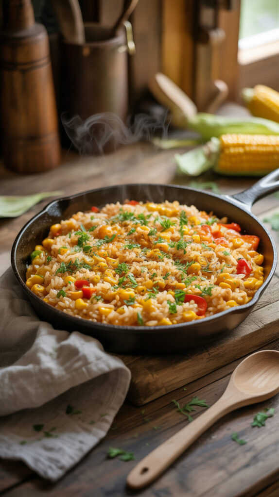 Weeknight cooking works best when everything cooks in one pan without complicated timing. Sweet corn and peppers bring natural sweetness that pairs perfectly with savory rice. The colors alone make dinner feel more exciting.